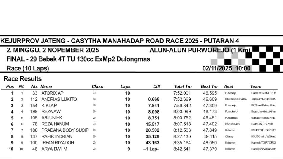 Kabaroto.id – Hai, sobat Kabar Oto, Casytha Manahadap Road Race 2025 seri 4 Purworejo, hari ke 2 (2/11) di buka dengan kelas exMP2 Dulongmas, siapa kah penguasa kelas ini? Yap, tampil konsisten dengan penuh determinasi, Atorix AP sang pembalap tuan rumah memenangi race pembuka hari ini. Pembalap yang tampil bersama tim Garasi 141 X KMF 12 Racing ini mengemas waktu 7:52.001.