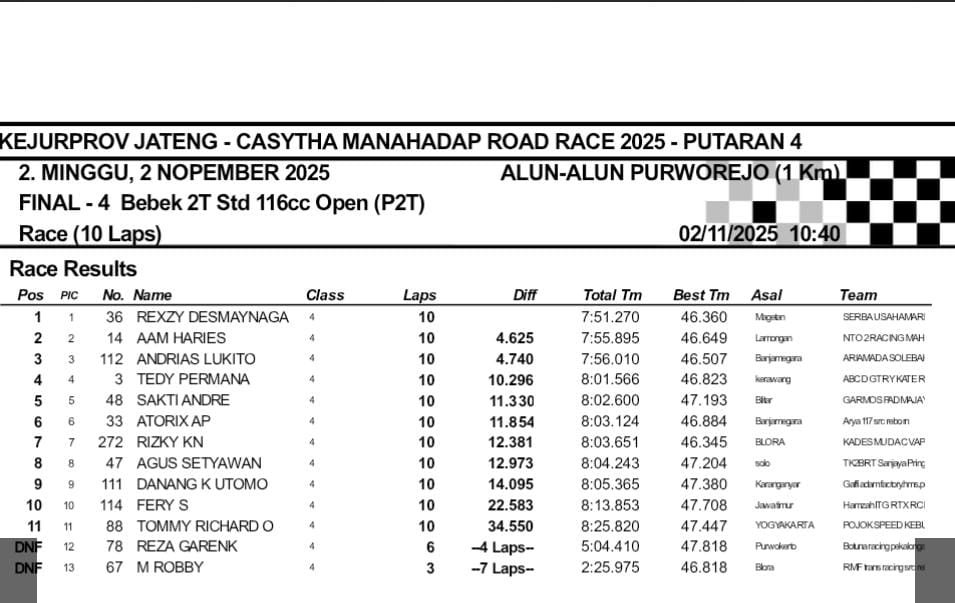 KabarOto.id – Semakin siang semakin panas, panas persaingan balap tentunya, masih dalam gelaran Casytha Manahadap 2025 seri 4, kali ini kelas bebek tiet 2tak 116cc open. Adalah Rexzy Kepo menjadi yang terbaik di kelas ini, pembalap megetan ini mengemas total waktu 7:51.270, dan membuatnya menjadi yang terbaik.