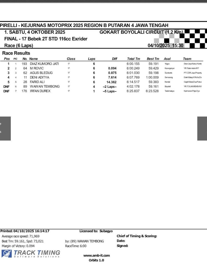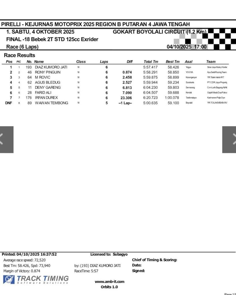 Kabaroto.id – Hai, sobat Kabar Oto, kita bawa kabar dari gelaran Motoprix putaran 4 boyolali sabtu (4/10) khususnya dikelas Ex-Rider alias kelasnya para mantan pembalap pro di masanya, yang kini masih ingin berkompetisi di arena balap road race. Yap, kali ini hasil manis diraih oleh pembalap senior asal Karanganyar, M Rovic, yang membuktikan semangat balapnya belum padam sedikit pun.
