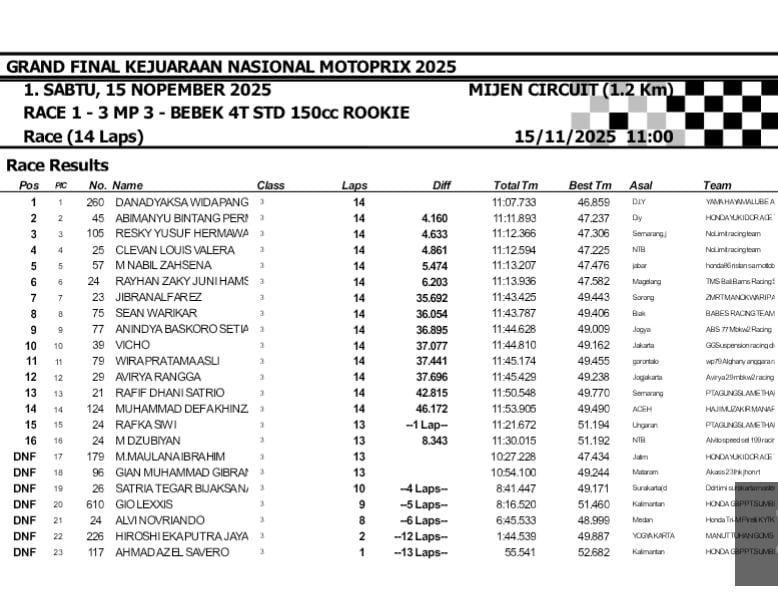 Di akhir laga, Gandewa berhasil menjaga ritme dan fokus hingga garis finis. Ia menang dengan selisih 0,515 detik dari Farrel yang harus puas sebagai runner-up. Tak kalah ketat, Gio membuntuti dengan gap 0,753 detik dari posisi kedua. Selisih waktu yang begitu rapat ini menegaskan bahwa kelas MP4 Beginner memang dipenuhi bakat-bakat muda yang haus prestasi.