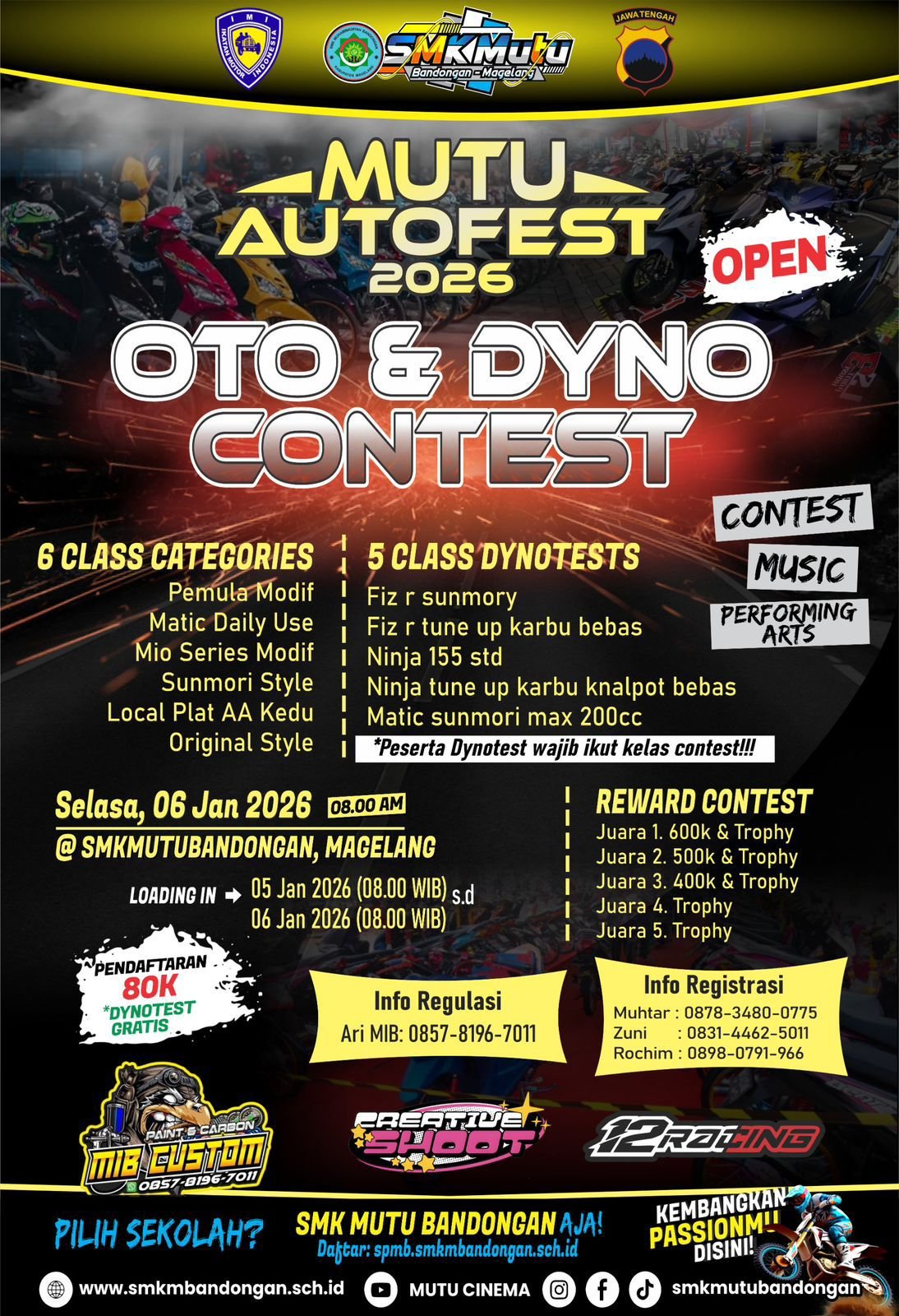 Oto & Dyno Contest digelar sebagai pemanasan menuju MUTU Autofest 2026 di Magelang. Hadirkan berbagai kelas kontes, dynotest, hadiah menarik, serta hiburan musik dan performing arts.