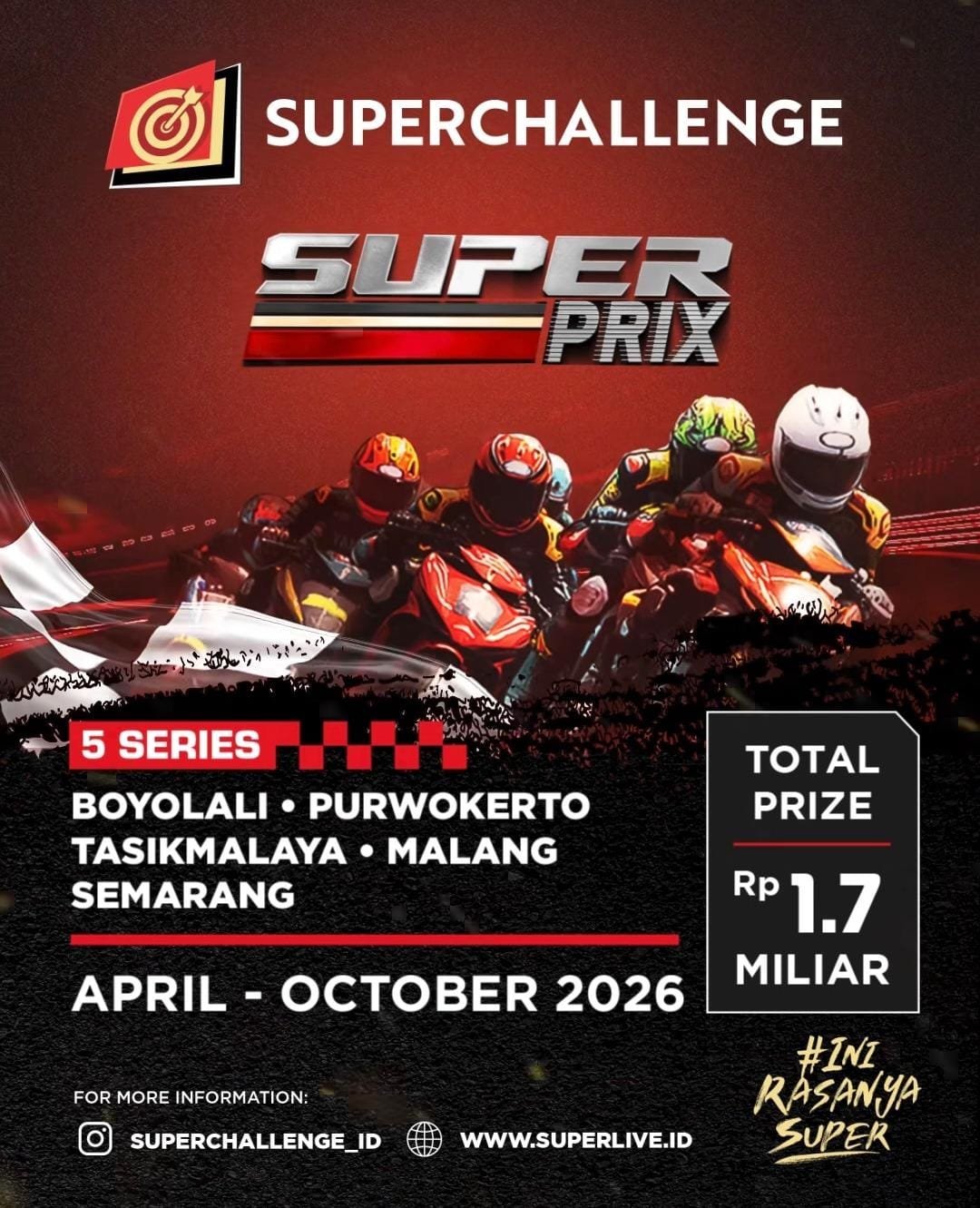 Yang bikin makin panas, musim ini total hadiah juga naik! Jika tahun lalu memperebutkan sekitar Rp1,6 miliar, kini Superchallenge Super Prix 2026 siap membagikan lebih dari Rp1,7 miliar. Nominal ini tentu jadi motivasi tambahan bagi para pembalap untuk tampil all-out di setiap seri.