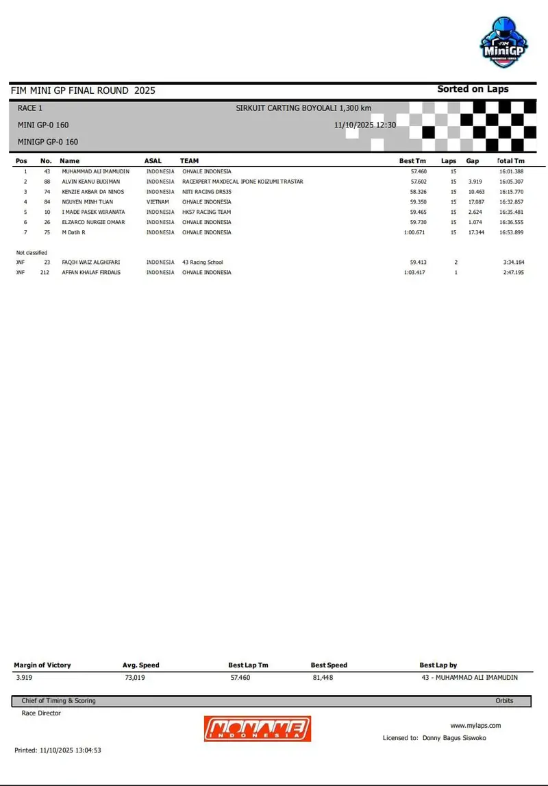 Di tengah panasnya persaingan, beberapa pembalap mengalami masalah: ada yang melebar di tikungan, bahkan beberapa gagal menyelesaikan balapan. Namun, M. Ali tetap konsisten dengan pace yang stabil. Fokus dan disiplin menjadi kunci, menjadikannya satu-satunya pembalap yang mampu menjaga jarak dan mendominasi sejak pertengahan lap hingga finis.