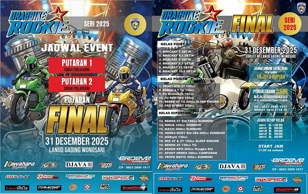 Dengan vibe pesta tahun baru yang berpadu aroma race fuel, balapan diprediksi berlangsung high tension, no drama, pure battle. Kita bakal tertuju pada para rookie alias para joki potensial sebelum sampai di level pro. Untuk kelas-kelas sudah tercantum di keterangan gambar yang KabarOto sematkan dalam artikel ini. Satu hal pasti, final ini bukan sekadar balapan, ini panggung lahirnya calon bintang drag bike Tanah Air. Bravo!