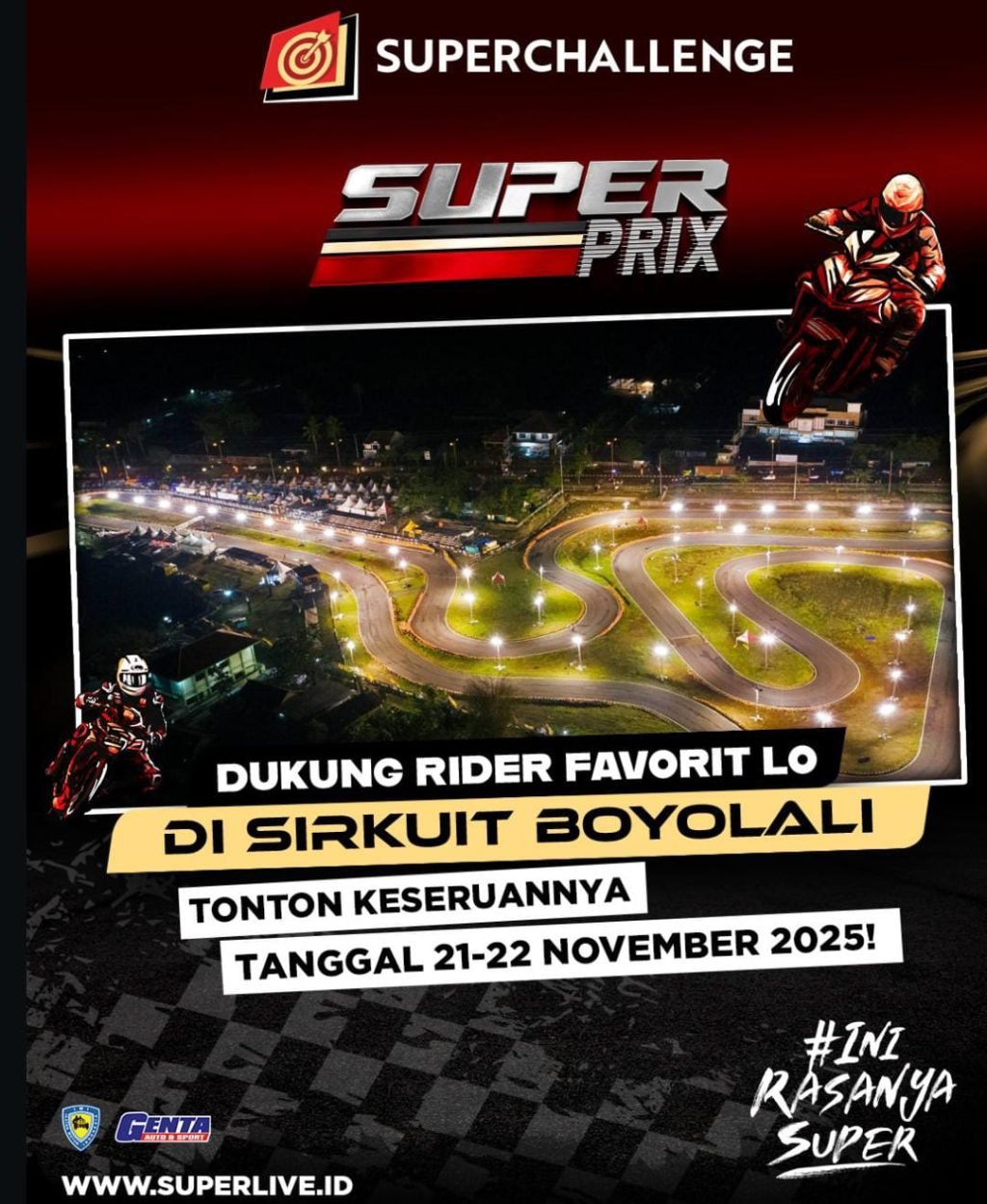 KABAROTO.ID – Ajang Final Superchallenge Super Prix 2025 akhirnya memasuki babak paling menentukan. Setelah melalui empat seri penuh drama, tensi persaingan, dan aksi menegangkan dari para rider terbaik Tanah Air, gelaran pamungkas ini akan berlangsung di Sirkuit Boyolali pada Jumat–Sabtu, 21–22 November 2025. Antusiasme peserta, tim, hingga para penggemar balap sudah terasa bahkan sebelum race day tiba.