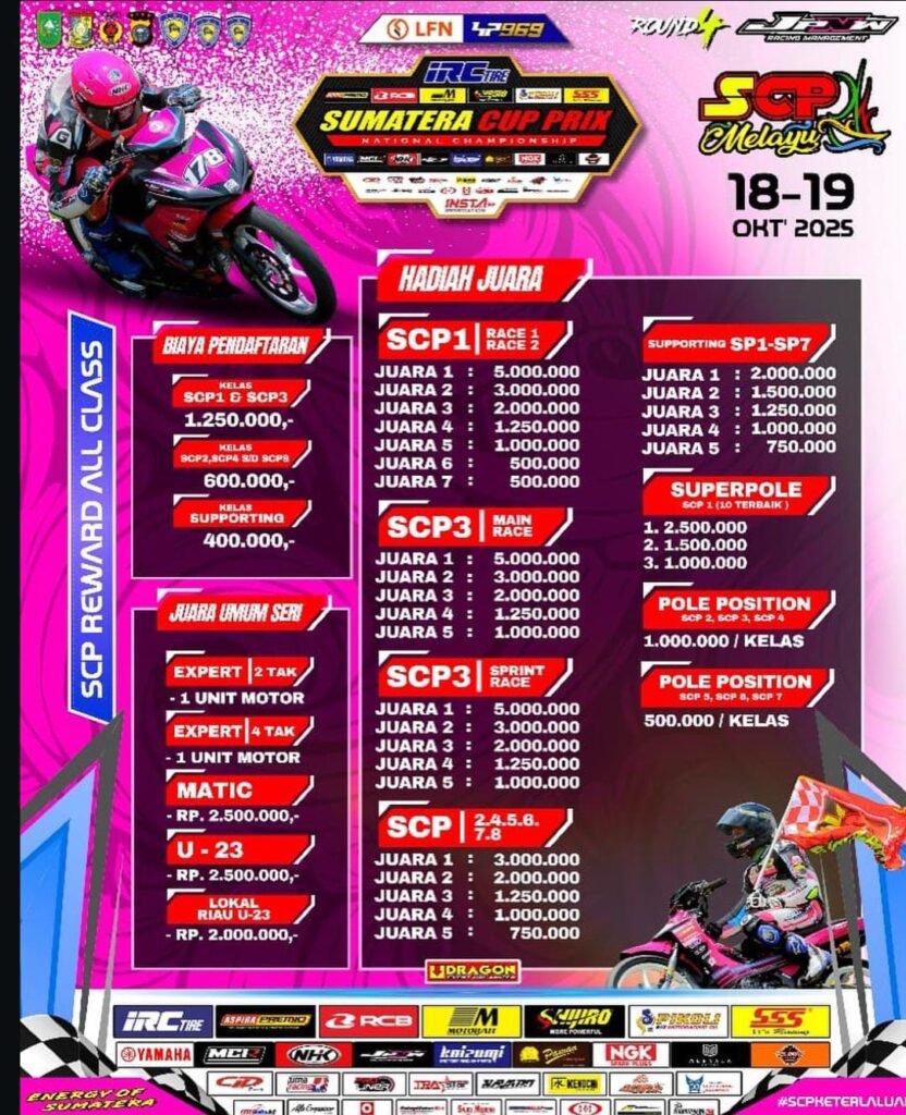 Kelas bergengsi siap di sajikan di event SCP 2025 seri 4 ini, dari kelas utama dan kelas supporting alias kelas pendukung menawarkan persaingan ketat. Terlebih ada hadiah menarik bagi juara umum dari Buncil Official Store dan juga Dragon EO, yakni 1 Unit Motor bagi juara umum 4tak dan 1 unit motor juga di kategori juara Umum 2tak. Tak ketinggalan kelas lain seperi matic, kelas U23, serta kelas khusus seperti lokal Riau U23 pun ada hadiah pembinaan juga, lengkap sekali hadiahnya.
