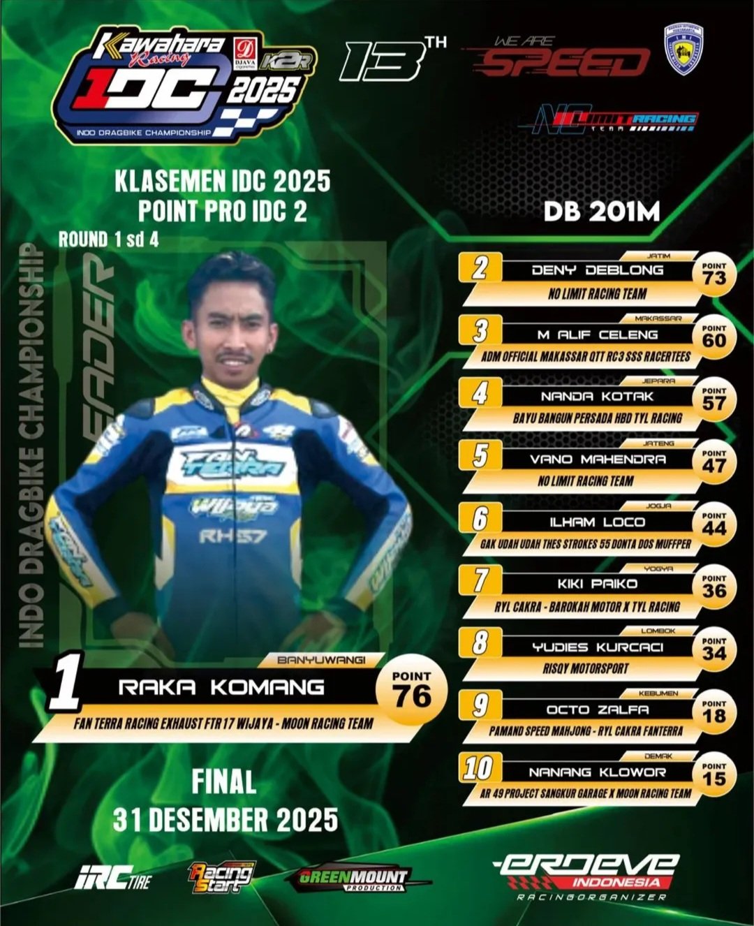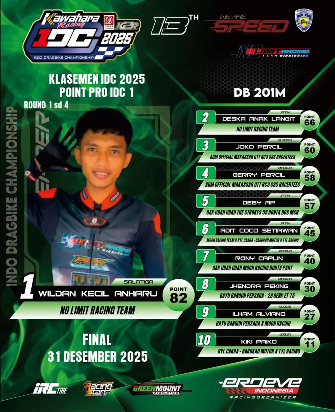 Menariknya, berbeda dari seri sebelumnya, partai puncak IDC Drag Bike 2025 tak digelar di akhir pekan. Balapan akan berlangsung pada Rabu, 31 Desember 2025, menjadikannya pesta balap spesial racikan Erdeve Indonesia sekaligus penutup kalender drag bike nasional. Malam tahun baru, mesin meraung, dan kita menunggu siapa jawaranya. Yuk, kita ngegas ke Lanud Gading. Bravo!